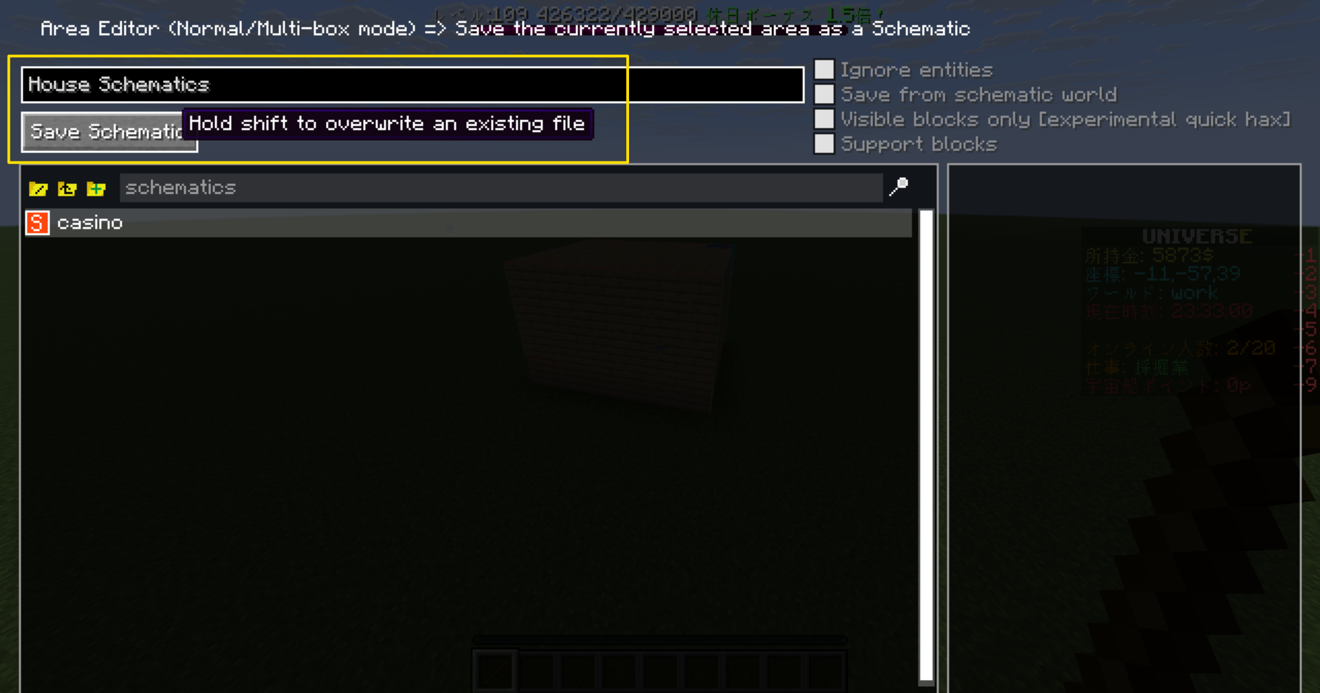 それに対して *.schematics (*.schematic) は Litematica が流行る前に存在していた設計図 Mod である MCEdit や Schematica などで使われていた「古い共通フォーマット」で, Litematica でも読み込めるが,材料リストなどのデータが使えないという欠点がある.